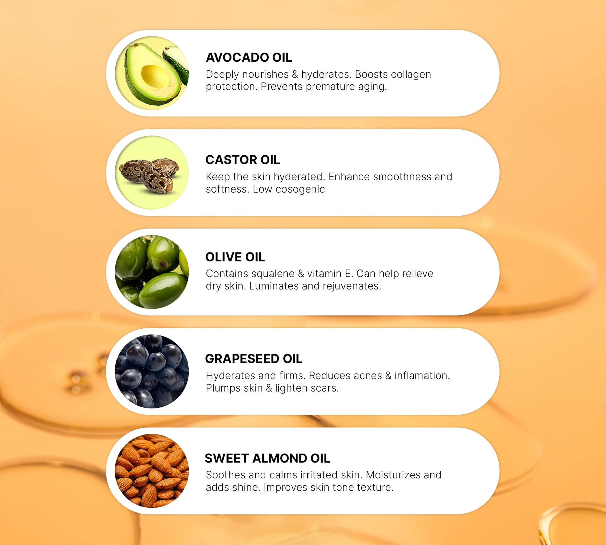 (Avocado Oil) - Persea Gratissima oil, (Castor Oil) - Ricinus Communis oil, (Grapeseed Oil) -  Vitis Vinifera oil, (Olive Oil) - Olea europaea oil (Sweet Almond Oil) Prunus amygdalus dulcis oil, Parfum/Fragrance Oil